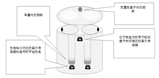霍爾效應(yīng)傳感器能夠很好地應(yīng)用于檢測(cè)充電盒蓋和耳塞充電情況。鑒于磁鐵已用來(lái)合上充電盒蓋,因此,以霍爾效應(yīng)開(kāi)關(guān)的形式使用磁感測(cè)解決方案檢測(cè)蓋子顯然是一種無(wú)需額外零件即可之際連接/斷開(kāi)藍(lán)牙的解決方案。此外,將磁鐵放進(jìn)在耳塞,是一種能夠檢測(cè)充電盒內(nèi)是否存在耳塞的從而有效充電方法。