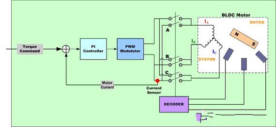正弦電流命令信號輸出一對在兩個(gè)適當(dāng)?shù)碾姍C(jī)繞組中調(diào)制電流的P-I控制器。第三個(gè)轉(zhuǎn)子繞組中的電流是受控繞組電流的負(fù)和,因此不能被分別控制。每個(gè)P-I控制器的輸出被送到一個(gè)PWM調(diào)制器,然后送到輸出橋和兩個(gè)電機(jī)終端。應(yīng)用到第三個(gè)電機(jī)終端的電壓源于應(yīng)用到前兩個(gè)線組的信號的負(fù)數(shù)和,適當(dāng)用于分別間隔120度的三個(gè)正弦電壓。