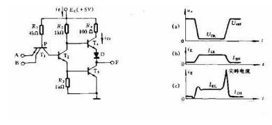 當(dāng)與非門的輸出由高電平轉(zhuǎn)換到低電平時,電容 CL 通過 T3 放電。此時放電電流不通過電源,故 CL 的放電電流對電源電流無影響。