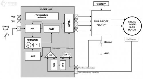 圖 1 顯示了基于 Microchip 的 8 位單片機(jī) PIC16F1613 的單相驅(qū)動(dòng)器。選擇這款單片機(jī)是因?yàn)槠湟_數(shù)較少,并且片上外設(shè)可以控制驅(qū)動(dòng)器開關(guān)、測(cè)量電機(jī)轉(zhuǎn)速、預(yù)測(cè)轉(zhuǎn)子位置以及實(shí)現(xiàn)故障檢測(cè)。本應(yīng)用使用以下外設(shè):互補(bǔ)波形發(fā)生器(CWG)、信號(hào)測(cè)量定時(shí)器(SMT)、模數(shù)轉(zhuǎn)換器(ADC)、數(shù)模轉(zhuǎn)換器(DAC)、捕捉 / 比較 / 脈寬調(diào)制(CCP)、固定參考電壓(FVR)、定時(shí)器、比較器和溫度指示器。上述外設(shè)通過(guò)固件在內(nèi)部進(jìn)行連接,因此可減少所需的外部引腳數(shù)。其中值得一提的是,互補(bǔ)波形發(fā)生器是一個(gè)好東西,由專門的硬件電路產(chǎn)生適合驅(qū)動(dòng)馬達(dá)的互補(bǔ)信號(hào),大大簡(jiǎn)化了程序設(shè)計(jì)。