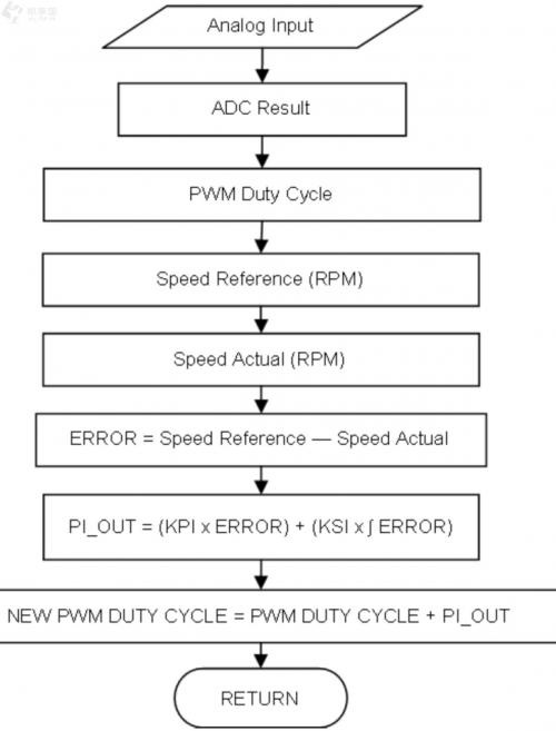 圖 2 中所示的外層回路用于控制電機(jī)在不同條件下的轉(zhuǎn)速,例如負(fù)載需求、干擾和溫度漂移變化等。轉(zhuǎn)速由 SMT 測(cè)量。SMT 是一款具有時(shí)鐘和門控邏輯的 24 位計(jì)數(shù)定時(shí)器,經(jīng)配置可用于測(cè)量多種數(shù)字信號(hào)參數(shù),如脈沖寬度、頻率、占空比以及兩輸入信號(hào)邊沿之間的時(shí)間差?赏ㄟ^(guò) SMT 的周期和占空比采集模式測(cè)量電機(jī)的輸出頻率。在此模式下,SMT 信號(hào)的占空比或周期都可基于 SMT 時(shí)鐘進(jìn)行采集。SMT 會(huì)計(jì)算單個(gè)電機(jī)旋轉(zhuǎn)周期內(nèi)的 SMT 時(shí)鐘數(shù),然后將結(jié)果存儲(chǔ)于捕捉周期寄存器中。使用該寄存器可獲得電機(jī)的實(shí)際頻率。將實(shí)際轉(zhuǎn)速與參考轉(zhuǎn)速進(jìn)行比較時(shí),如果實(shí)際轉(zhuǎn)速高于設(shè)定的參考轉(zhuǎn)速,則產(chǎn)生正誤差;如果實(shí)際轉(zhuǎn)速低于設(shè)定的參考轉(zhuǎn)速,則產(chǎn)生負(fù)誤差。此誤差會(huì)饋入 PI 控制器。PI 控制器是一種固件算法,用于計(jì)算轉(zhuǎn)速偏差的補(bǔ)償值。在初始 PWM 占空比的基礎(chǔ)上加減此補(bǔ)償值可得到新的占空比值。