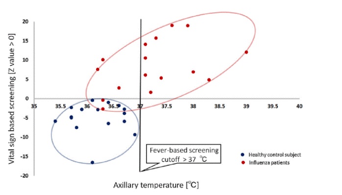 由下圖可見,傳統(tǒng)的單純體溫檢測法(大于37°截止閾值),二象限內(nèi)的樣本都會被遺漏掉,會存在大量的漏檢。