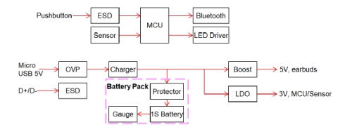 TWS一般有兩個耳機,他們的系統(tǒng)都是一樣的,詳細框圖如下: