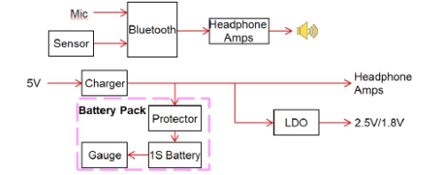 電池一般都是單節(jié)鋰電池,一般是由電池包廠商提供,并且已經(jīng)將電量計和二次保護IC封包在內(nèi),保證電池更可靠的工作。單節(jié)鋰電池的電源主要供給兩部分:一部分升壓到5V給耳機供電,另一部分降壓到3V及以下給盒子內(nèi)的MCU/Sensor等。