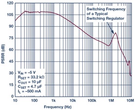 人們常常使用線性穩(wěn)壓器代替無源LC濾波器來清理開關(guān)穩(wěn)壓器產(chǎn)生的電壓。它們通常具有很高的電源電壓抑制比(PSRR)。這意味著,線性穩(wěn)壓器的大部分輸入紋波會被阻擋,因此線性穩(wěn)壓器的輸出紋波很少。此外,線性穩(wěn)壓器的輸出電壓有自己的閉環(huán)回路,因此會進(jìn)行較好的精確調(diào)節(jié)。