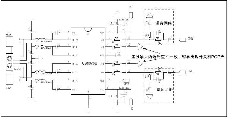 大部分D類功放都是差分輸入,如果差分輸入兩端參數(shù)不一致,功放上電,掉電時(shí)兩邊充放電時(shí)間不一樣。兩邊相減后就會(huì)現(xiàn)額外的電信號(hào),這個(gè)電信號(hào)再經(jīng)功放放大到喇叭端就會(huì)出現(xiàn)POP聲。所以盡量保持差分兩端網(wǎng)絡(luò)以及參數(shù)一致。如果主控解碼輸出是單端信號(hào),又有復(fù)雜的調(diào)音網(wǎng)絡(luò),建議用運(yùn)放隔離可以克服這個(gè)問(wèn)題。