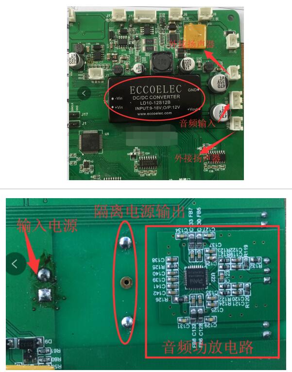 在我拆解小船機器人時候,發(fā)現(xiàn)小船就是用的這種電源隔離方式設(shè)計音頻的,實物拍攝如下圖所示。