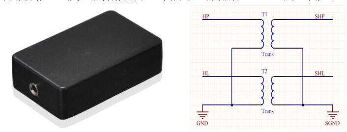 下圖為我在網(wǎng)上能買到的音頻隔離器,其內(nèi)部電路為耦合電感,電路示意圖如下: