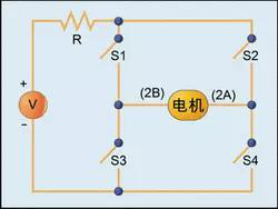H橋通過一個電阻連接到一個電壓固定的直流電源(其幅度可根據(jù)電機的要求選取),然后,該電路再經(jīng)過4個開關(分別標為S1、S2、S3和S4)連接到繞組的兩根抽頭。這一電路的分布看起來有點象一個大寫字母H,因此叫做H橋。