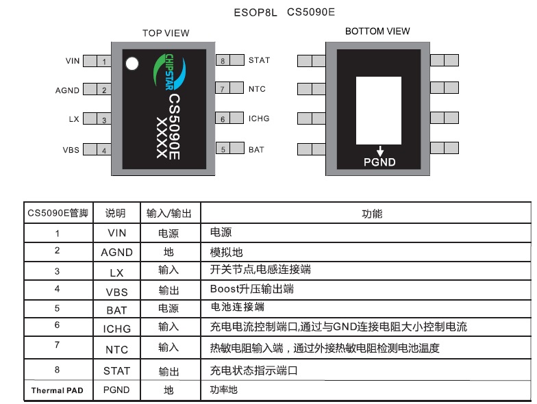 CS5090E是一款5V輸入,最大1.5A充電電流,支持雙節(jié)鋰電池串聯(lián)應(yīng)用 ,鋰離子電池的升壓充電管理IC.CS5090E集成功率MOS,采用異步開關(guān)架構(gòu),使其在應(yīng)用時(shí)僅需極少的 外圍器件,可有效減少整體方案尺寸,降低BOM成本。CS5090E的升壓開關(guān)充電轉(zhuǎn)換器的工作頻率為500KHz,轉(zhuǎn)換效率為90%。CS5090E輸入電壓為5V,內(nèi)置自適應(yīng)環(huán)路,可智能調(diào)節(jié)充電電流,防止拉掛適配器輸出可匹配所有適配器。CS5090E提供了纖小的ESOP8L封裝類型供客戶選擇,其額定的工作溫度范圍為-40℃至85℃。