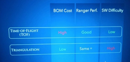 上表是詳細(xì)對比,實(shí)際上來說,TOF(Time of Flight)方法在性能上比較占優(yōu),但成本相對更高。而三角測距法則相反,在成本上,它是一種非常占優(yōu)的方案。但是其缺點(diǎn)在于如果軟件的復(fù)雜度不夠高,在進(jìn)行遠(yuǎn)距離的測量的時候,性能就會下降得特別快。