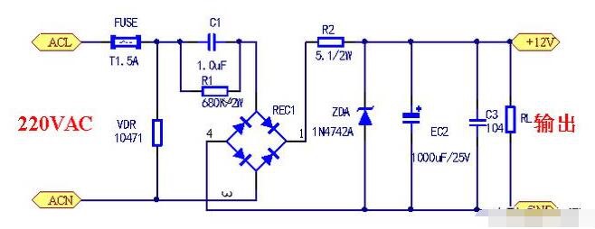 穩(wěn)壓二極管在電路中常用“ZD”表示,穩(wěn)壓二極管最主要的幾個參數(shù)有:穩(wěn)壓值、耗散功率、最大工作電流,在設(shè)計電路時候要充分考慮這三個因素,如下圖是阻容降壓電路,電壓輸出12V,采用1N4742A穩(wěn)壓二極管,它的穩(wěn)壓值是12V,功率1W。