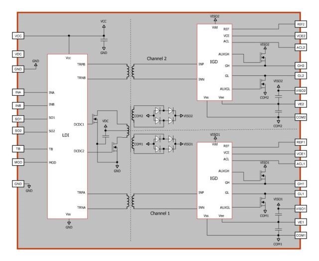 該公司的SID11x2K系列以標(biāo)準(zhǔn)eSOP封裝的單通道IGBT和MOSFET驅(qū)動器為代表。該系列采用固體絕緣體FluxLink技術(shù)提供增強(qiáng)型電氣隔離。其8 A峰值輸出電流能夠驅(qū)動高達(dá)600 A(典型值)的設(shè)備,而無需任何其他有源組件。