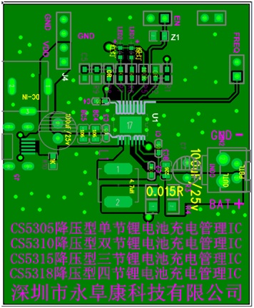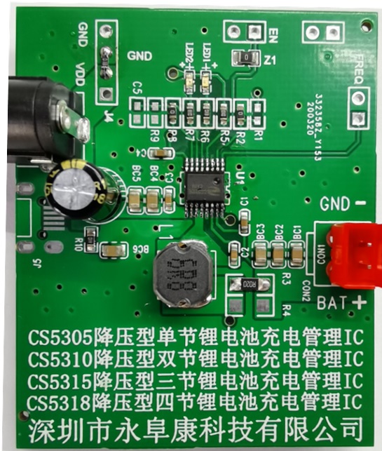 深圳市永阜康科技有限公司結(jié)合客戶實(shí)際應(yīng)用方案,推出管腳兼容的單節(jié)/兩節(jié)/三節(jié)/四節(jié)鋰電池同步降壓型充電管理芯片系列:CS5305/CS5310/CS5315/CS5318,耐壓高達(dá)28V。該系列芯片具有頻率抖動(dòng)的功能,大大改善系統(tǒng)的EMI特性;充電電流最高可達(dá)3A,效率90%以上;全系列型號(hào)都具備完整的涓流,恒流,恒壓充電過(guò)程;具有終止電流可編程功能,通過(guò)設(shè)置不同的外部分壓電阻, 可以很方便的調(diào)節(jié)充電終止電流的大;各種安全可靠的保護(hù)措施以及雙LED燈充電狀態(tài)指示,還帶了NTC溫度控制功能;全系列芯片采用獨(dú)有的EQA-16封裝,尺寸與SOP-8大小相當(dāng)。廣泛應(yīng)用于按摩儀、榨汁機(jī)、藍(lán)牙音響、廣場(chǎng)舞音響、無(wú)人機(jī)等案列。