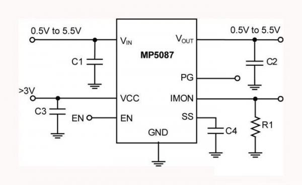 MP5087具有非常精確的電流監(jiān)控功能。 電流監(jiān)視器的增益可以縮放到不同的應(yīng)用。 借助軟啟動(dòng)功能,MP5087可以避免電路啟動(dòng)期間的浪涌電流。 MP5087還提供不同的功能,例如可編程軟啟動(dòng)時(shí)間,輸出放電功能,OCP和熱關(guān)機(jī)功能。
