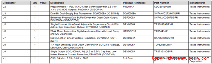 TI公司的TAS5441-Q是單路D類音頻放大器,能從14.4Vdc汽車電池向4 Ω負載提供THD+N小于10%的高達22W功率.滿足 AEC-Q100汽車規(guī)范,工作電壓4.5V到18V, 4 Ω負載時的效率85%,差分模擬輸入,75dB電源抑制比例(PSRR),具有負載診斷功能如開路和短路輸出負載,輸出對電源和輸出對地短路.保護和檢測功能包括有短路保護,40V負載突降保護per ISO-7637-2,播放音樂時輸出DC電平檢測,超溫保護以及過壓和欠壓保護.主要用在汽車緊急呼叫(eCall)放大器,汽車通訊系統(tǒng),儀表盤系統(tǒng)和信息娛樂音頻.本文介紹了TAS5441-Q主要特性,功能框圖,應用電路,評估板TAS5441-Q1 EVM主要特性,電路圖,材料清單和PCB設計圖.