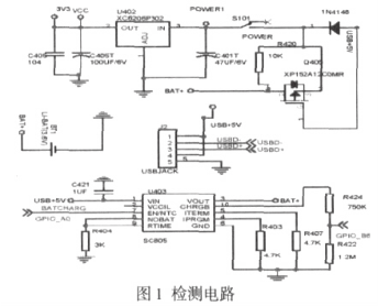 在本文中檢測電路僅僅列出鋰電池檢測電路的原理圖,該設(shè)計考慮到了鋰電池的過壓特性,于是選用 SC805 電池檢測芯片來進(jìn)行硬件電路的設(shè)計。如下圖所示,電路圖一部分是對于 USB 充電和過壓的保護(hù)設(shè)計,另一部分為電池電量檢測