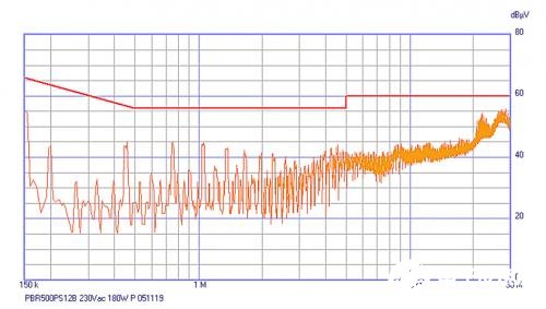 作為實驗,XPPower的PBR500PS12B型AC-DC轉(zhuǎn)換器的EMI性能在230VAC和180W負載下繪制,結(jié)果如圖2所示。根據(jù)標準要求,轉(zhuǎn)換器符合EN55032曲線B級輻射限值,具有良好的裕度,用于準峰值檢測。增加了一個額外的濾波器,型號為XPPowerFCSS06SFR,衰減特性如圖3所示。實線是共模和虛線差模衰減。