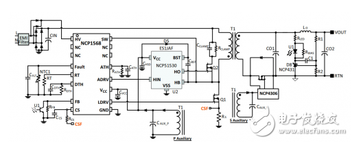 NCP1568提供智能和控制,NCP51530是集成的高、低邊驅(qū)動器,在達700 V的電壓提供兩個N溝道功率MOSFET的高效功率開關,從而在緊湊的空間實現(xiàn)高性能的電源方案。NCP51530適用于具有較短傳播延遲以及快速上升和下降時間的高頻工作。傳輸延遲(5ns)的嚴格匹配有助于提高所有應用的能效。