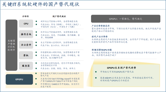 縱觀整個(gè)IT系統(tǒng),從CPU、操作系統(tǒng)、辦公套件、整機(jī)到服務(wù)器,我們都已經(jīng)初步具有一些商用化的可替代產(chǎn)品。唯獨(dú)在GPGPU領(lǐng)域,目前還是一片空白。如下圖所示: