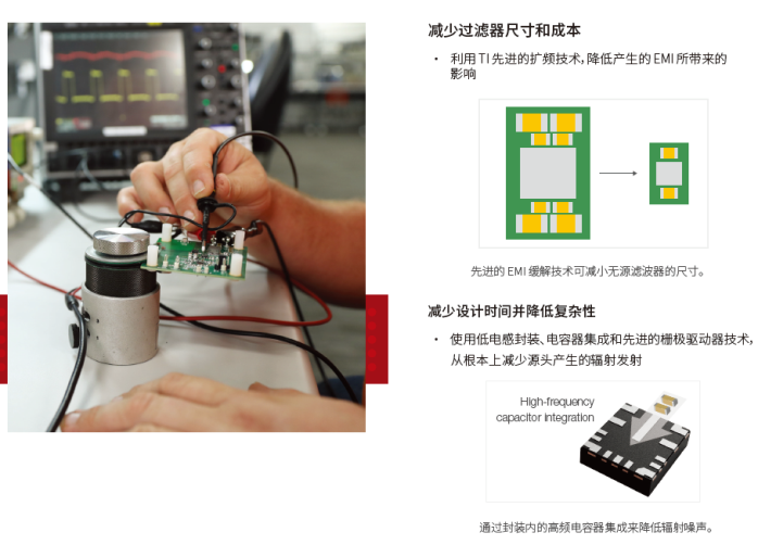 此。低 EMI 設(shè)計可為您顯著縮短開發(fā)周期,同時還可減少電路板面積和解決方案成本。TI 可提供