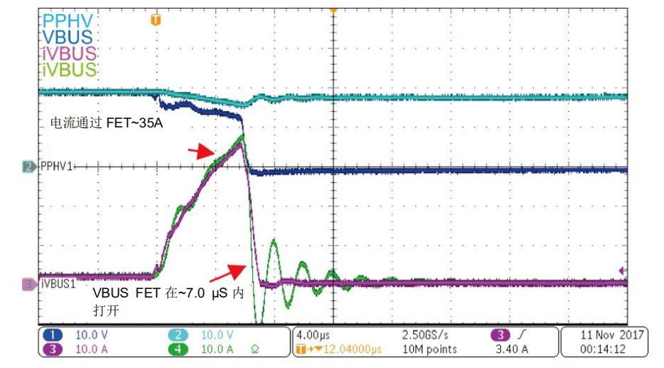 圖4重點說明了在具有適當保護的電源路徑的VBUS對地短路期間會發(fā)生的情況。當VBUS上的電流迅速上升至約35 A時,USB PD控制器檢測到此大電流并立即斷開FET。VBUS對地短路保護必須通過硬件比較器作為固件來實現(xiàn)。固件實現(xiàn)無法足夠快速地做出反應以保護電源路徑和系統(tǒng),這種電源路徑快速關(guān)斷可在發(fā)生硬短路時保護系統(tǒng)和FET。
