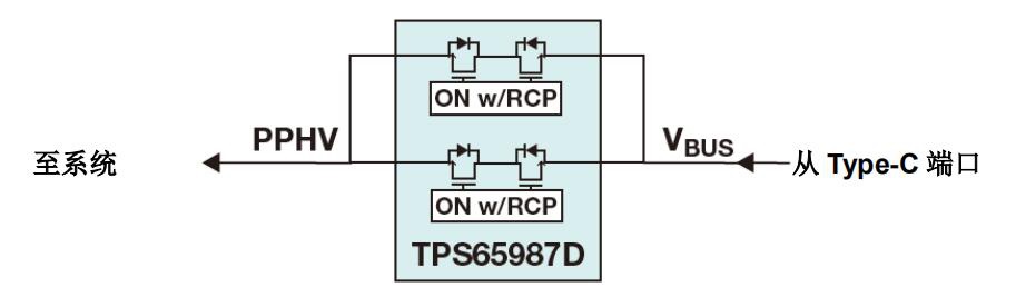 根據(jù) USB PD 協(xié)議,在其配置通道(CC)線路上帶有RD 的設(shè)備必須將 DC/DC 控制器的輸出電容與 VBUS 隔離。在這種情況下,系統(tǒng)必須具有 VBUS FET 以滿足此協(xié)議。TPS65987D 有兩個高壓背對背集成 FET,可滿足此要求。TPS65987D 中的內(nèi)部 FET 在 25°C 環(huán)境溫度下的 RDS(on)約為 25mΩ。對于高電流應用,此電阻可能太高。當 5 A 的電流通過其中一個內(nèi)部 FET 時,F(xiàn)ET中將消耗大約 750 mW 的功率。通過雙電源模式,TPS65987D 能夠同時并聯(lián)關(guān)閉其兩個內(nèi)部電源路徑。這種模式有效地將電源路徑的 RDS(on)減半,并且還使FET 內(nèi)部的功耗減半。圖 3 重點說明了 PD 控制器如何與此電源架構(gòu)連接。