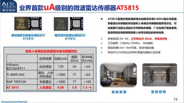 此次隔空智能最新推出的AT5815是全球首款超低功耗微波雷達(dá)傳感器,具備雷達(dá)傳感器的高性能和紅外傳感器的超高性價(jià)比,是一種新型人體感應(yīng)類傳感器,也是傳統(tǒng)紅外熱釋電傳感器升級(jí)換代的首選,可廣泛應(yīng)用于智能家具、智慧照明及安防監(jiān)控等需要人體存在感應(yīng)的各類場景。
