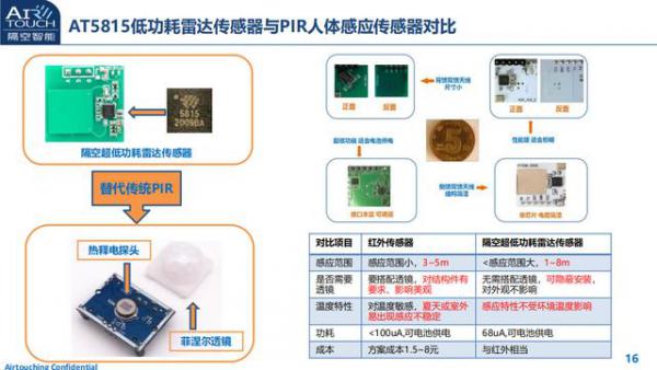 根據(jù)隔空智能公布AT5815低功耗雷達(dá)傳感器與POR人體感應(yīng)傳感器對(duì)比數(shù)據(jù)來看,AT5815的感應(yīng)范圍更大,且無需搭配透鏡,可隱藏安裝,感應(yīng)特性不受環(huán)境溫度影響,功耗也更低,成本與紅外相當(dāng)。林水洋表示AT5815可以很好的替代PIR人體感應(yīng)傳感器。