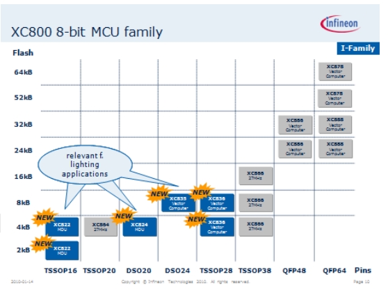 除快速精確控制多通道LED的產品之外,英飛凌還提供XC82x和 XC83x系列產品。這兩個系列的器件通過集成電容式觸控控制器,具備適用于感應式觸摸輪等HMI接口的特性,比如全新XC822T。