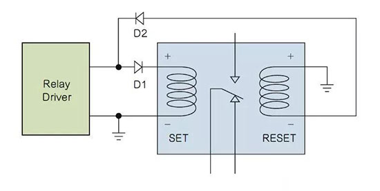 操作的原理很簡單。當(dāng)線圈驅(qū)動(dòng)器輸出電壓為正時(shí),電流流過二極管D1以激勵(lì)設(shè)定線圈,而復(fù)位線圈不供電,因?yàn)镈2阻斷電流。繼電器進(jìn)入設(shè)定狀態(tài)。當(dāng)電壓為負(fù)時(shí),二極管D1阻斷流過設(shè)定線圈的電流,二極管D2開始激勵(lì)復(fù)位線圈。