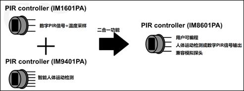圖1  M8601 可編程數(shù)PIR信號(hào)調(diào)理芯片, 結(jié)合了數(shù)字PIR芯片和智能人體運(yùn)動(dòng)檢測(cè)功能