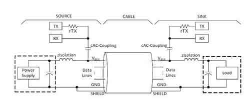 如圖所示,在USB PD通信中,是將24MHz的FSK通過cAC-Coupling耦合電容耦合到VBUS上的直流電平上的,而為了使24MHz的FSK不對(duì)PowerSupply或者USBHost的VBUS直流電壓產(chǎn)生影響,在回路中同時(shí)添加了zIsolation電感組成的低通濾波器過濾掉FSK信號(hào)。