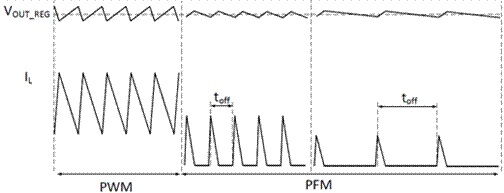 · 采用TI專利的SOO(平滑開通/關斷時間控制)技術,支持輕載時PWM模式到PFM模式的無縫過渡,實現(xiàn)全負載下無電壓漂移,滿足嚴苛的輸出電壓精度要求,并能通過延長關斷時間toff來大幅提升輕載效率,如圖3所示。