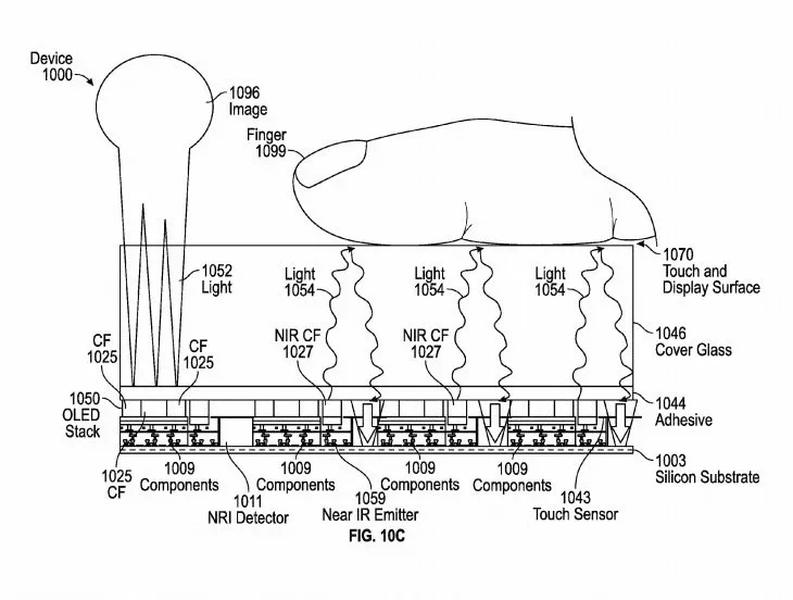 在光學(xué)屏下指紋識(shí)別方面,很多公司已經(jīng)開(kāi)始做出了嘗試,并有了初步結(jié)果。匯頂科技就展示過(guò)利用 AMOLED 屏幕實(shí)現(xiàn)屏下指紋識(shí)別的案例,演示機(jī)型為三星 Galaxy S7 Edge 和 vivo Xplay6。而匯頂科技就是在屏幕下方布置了一個(gè) CMOS 傳感器,根據(jù)匯頂科技在美帝注冊(cè)的專利:玄機(jī)就在這三張圖里了。