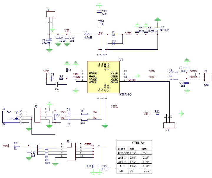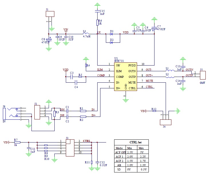 HT8731特有的自適應(yīng)動(dòng)態(tài)升壓,能根據(jù)芯片需要輸出功率的大小來(lái)對(duì)應(yīng)調(diào)整電源模塊的輸出電壓,最大限度提高鋰電池的續(xù)航時(shí)間;其輸入電流限制功能可設(shè)定最大輸入電流,以免因鋰電池瞬間電壓跌落太低造成主控重啟;能通過(guò)一個(gè)主控IO口實(shí)現(xiàn)關(guān)斷、開(kāi)啟、D類(lèi)/AB類(lèi)、防破音開(kāi)啟/關(guān)閉等各種模式的切換,節(jié)省藍(lán)牙主控的資源;2檔防破音模式,ACF1寬動(dòng)態(tài)音量震撼模式適合戶(hù)外藍(lán)牙音箱,ACF2高保真低失真模式適合小箱體的藍(lán)牙音箱,兩種模式選擇只需要改動(dòng)外圍電阻,便可呈現(xiàn)不同風(fēng)格的音質(zhì)。