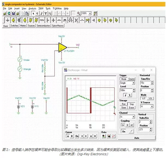 如果比較器輸入端存在噪聲或雜散信號(hào),則可能會(huì)發(fā)生多次閾值交叉且輸出可能會(huì)隨著閾值交叉進(jìn)行多次轉(zhuǎn)換(圖 2)。