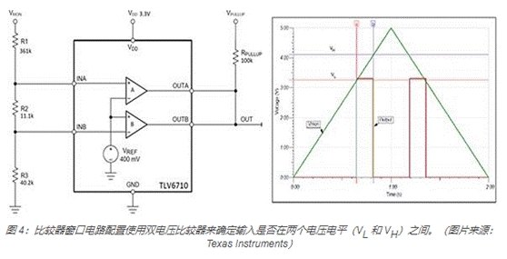 單電壓比較器可以檢測(cè)輸入電壓是高于還是低于參考閾值。確定輸入電壓是否在兩個(gè)極限之間時(shí)(稱為開窗),需要使用兩個(gè)比較器,每個(gè)極限值使用一個(gè)比較器(圖 4)。