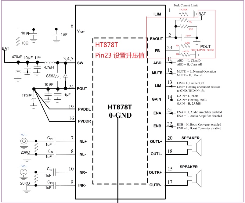 HT878 2X8.5W/2.7V-5.5V(內(nèi)置自適應(yīng)升壓模塊)/4Ω TSSOP-24 2.5V-5.5V 可任意限幅、單節(jié)鋰電池內(nèi)置升壓的8W雙聲道音頻功放IC