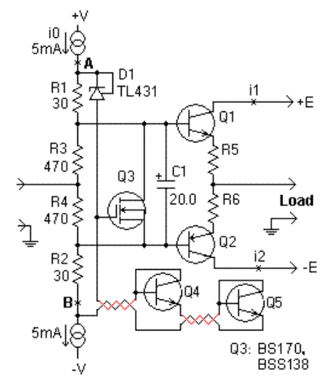 通過串聯(lián)更多的晶體管可以增加補償:使用兩個串聯(lián)的晶體管Q4和Q5,而不是只使用一個。所以電壓變化可以加倍。當晶體管Q1和Q2不共用一個散熱器時,這也會有所幫助。然后,將Q4(Q5)與Q1(Q2)放置在同一個散熱器上以控制溫度。