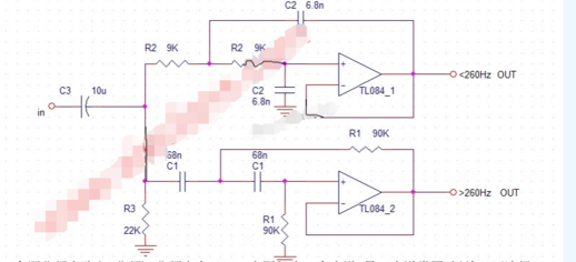 有源分頻電路(二分頻),分頻點(diǎn)在260Hz,上圖僅為一個(gè)聲道,另一聲道類同,運(yùn)放IC可選擇1個(gè)4通道運(yùn)放TL084(電壓:7V-36V),或者選擇兩個(gè)NE5532(10-30v),JRC4580(4-32V)