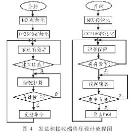 系統(tǒng)軟件的設計主要是MSP430F2249內(nèi)部的初始化和射頻芯片CC2500寄存器的設置以及發(fā)射、接受數(shù)據(jù)的讀寫操作。調(diào)用SimpliciTI協(xié)議棧中的BSP,MRFI,NWK,NWK APPLI CATION,其中BSP是最基礎的板級硬件,MCU初始化CC2500函數(shù)以及LED、按鍵操作函數(shù);MRFI是屬于射頻接口層,提供射頻芯片的選擇,射頻芯片的配置參數(shù),射頻芯片的驅(qū)動以及通信接口,NWK和NWK_APPLICATION是網(wǎng)絡層和網(wǎng)絡應用層,屬于SimpliciTI協(xié)議棧的內(nèi)容,包括網(wǎng)絡的建立,網(wǎng)絡地址的分配,網(wǎng)絡數(shù)據(jù)幀結構、數(shù)據(jù)消息隊列,數(shù)據(jù)消息處理,網(wǎng)絡通信安全加密等一系列復雜機制,通過簡單的函數(shù)調(diào)用實現(xiàn)了基本的硬件操作。無線收發(fā)器發(fā)送端和接收端的軟件設計流程圖如圖4所示。