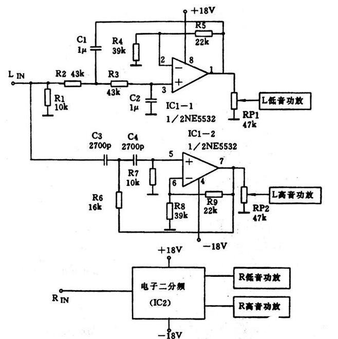 使用NE5532構(gòu)成的電子二分頻前級電路,可以把高音信號,用小功率功放放大,而低音用較大功率的功放放大,各司其職互不干擾。體積小成本低,分頻點準確,分頻曲線理想,制作和調(diào)試容易。