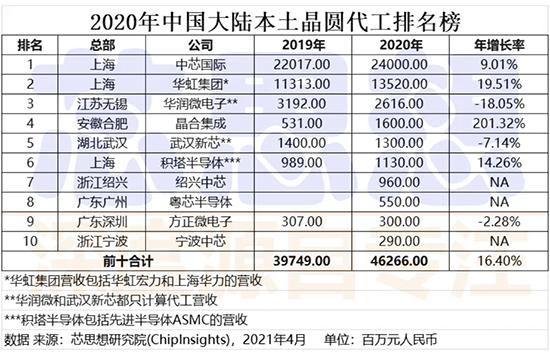 根據(jù)芯思想研究院發(fā)布的數(shù)據(jù)顯示,2020年的榜單較2019年榜單加了三家公司,分別是紹興中芯、粵芯半導(dǎo)體、寧波中芯。2020年中國(guó)大陸本土晶圓代工公司總體營(yíng)收高達(dá)463億元,較2019年397年增加66億美元,扣除紹興中芯、粵芯半導(dǎo)體和寧波中芯的營(yíng)收18億元,原有7大代工公司的營(yíng)收增長(zhǎng)了48億元。