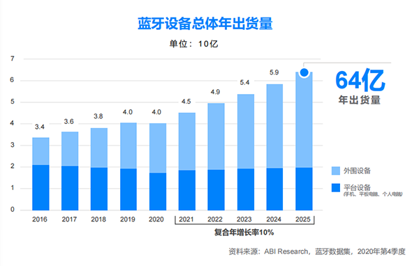 藍牙技術聯(lián)盟剛剛發(fā)布的《2021 年藍牙市場最新資訊》報告顯示,盡管受新冠疫情影響,藍牙設備年出貨量的增長速度延緩了一年時間,但預計未來可穿戴設備和定位系統(tǒng)等部分市場將會實現(xiàn)大幅增長。報告稱,雖然過去一年藍牙市場的增長速度有所減緩,但預計至 2025 年,藍牙設備年出貨量將從 2020 年的 40 億臺增至 64 億。