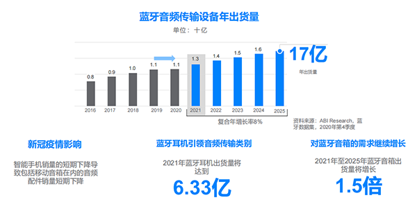 受新冠疫情影響,智能手機銷量的短期下降,導致了包括移動音箱在內(nèi)的音頻配件銷量短期下降。2020 年藍牙音頻傳輸設備的年出貨量為 11 億,與上一年持平。但即便如此,藍牙耳機仍然引領了藍牙音頻傳輸類設備的出貨量,2021 年藍牙耳機出貨量將達到 6.33 億,幾乎占整體市場的一半。與此同時,對藍牙音箱的需求將持續(xù)增長,2021-2025 年藍牙音箱出貨量將增長 1.5 倍。根據(jù)預測,整體藍牙音頻傳輸設備的年出貨量到 2025 年將達到 17 億。