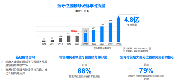 報告顯示,為減緩疫情傳播速度,在疫情期間,專業(yè)人員被禁止出差,以至于無法在設施內(nèi)安裝設備位置服務,導致位置服務部署速度相較 2020 年疫情前的預期減緩了 25%。但是,預計整個 2021 年該市場的增長速度將恢復到疫情前水平,2021 年底,藍牙位置服務部署總量將達到 26.2 萬,至 2025 年部署量將上升到 55 萬。