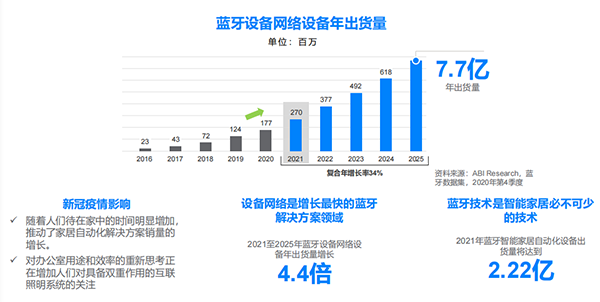 受疫情的影響,人們待在家中的時間明顯增加,這推動了家居自動化解決方案銷量的增長。同時,對辦公室用途和效率的重新思考,正在增加人們對具備雙重作用的互聯(lián)照明系統(tǒng)的關注。這將推動設備網(wǎng)絡設備在未來五年實現(xiàn) 34% 的復合年增長率,根據(jù)報告預測,2021 年藍牙設備網(wǎng)絡設備的出貨量將達到 2.7 億。2021 年至 2025 年藍牙設備網(wǎng)絡設備年出貨量將增長 4.4 倍。