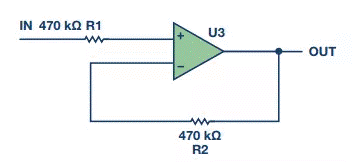 電阻熱噪聲的計(jì)算公式為√4kTRB,故1 kΩ電阻會(huì)有4 nV/√Hz的噪聲。增加電阻會(huì)增加噪聲。圖2中,出人意料的是,雖然909 Ω補(bǔ)償電阻是值最低的電阻,但由于從該節(jié)點(diǎn)到輸出端的噪聲增益,它給圖2輸出端貢獻(xiàn)的噪聲最多。R1引起的輸出噪聲為40 nV/√Hz,R2為12.6 nV/√Hz,R3為42 nV/√Hz。因此,請(qǐng)勿使用電阻。另一方面,如果運(yùn)算放大器采用雙電源供電,并且一個(gè)電源先于另一個(gè)電源上電,那么ESD網(wǎng)絡(luò)可能發(fā)生閂鎖問(wèn)題。這種情況下,可能希望增加一定的電阻來(lái)保護(hù)器件。但若使用的話,應(yīng)在電阻上放置一個(gè)旁路電容以減少電阻的噪聲貢獻(xiàn)。