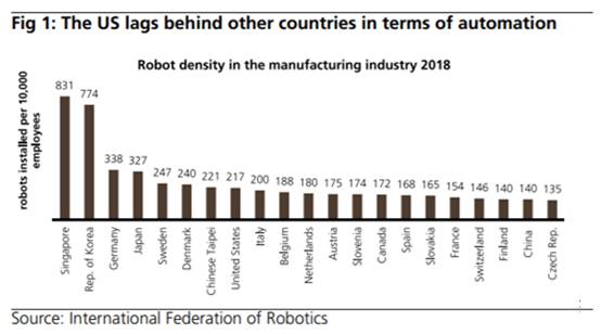 我們認(rèn)為,該公司在工業(yè)市場上具有強(qiáng)大領(lǐng)導(dǎo)地位的原因之一是因?yàn)樗麄冊(cè)趤喼瞢@得了大量收入。到2020年,該公司來自亞洲的收入已增長到其總收入的三分之二,并且仍然是其最重要的地區(qū)。該制造主導(dǎo)區(qū)域占全球制造輸出的40%以上,是工業(yè)自動(dòng)化市場的熱點(diǎn)區(qū)域。根據(jù)國際機(jī)器人聯(lián)合會(huì)的數(shù)據(jù),制造業(yè)中機(jī)器人密度最高的5個(gè)國家中,有3個(gè)是亞洲國家,分別是新加坡,韓國和日本。相比之下,占全球總產(chǎn)量20%的中國排在第20位。但我們相信,他們有望在政府的大力支持下崛起。